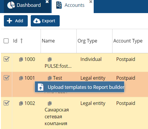 • ​​The main working window consists of: a unique contract ID number, name, organization type, account type, contract creation date, number of objects and other fields).