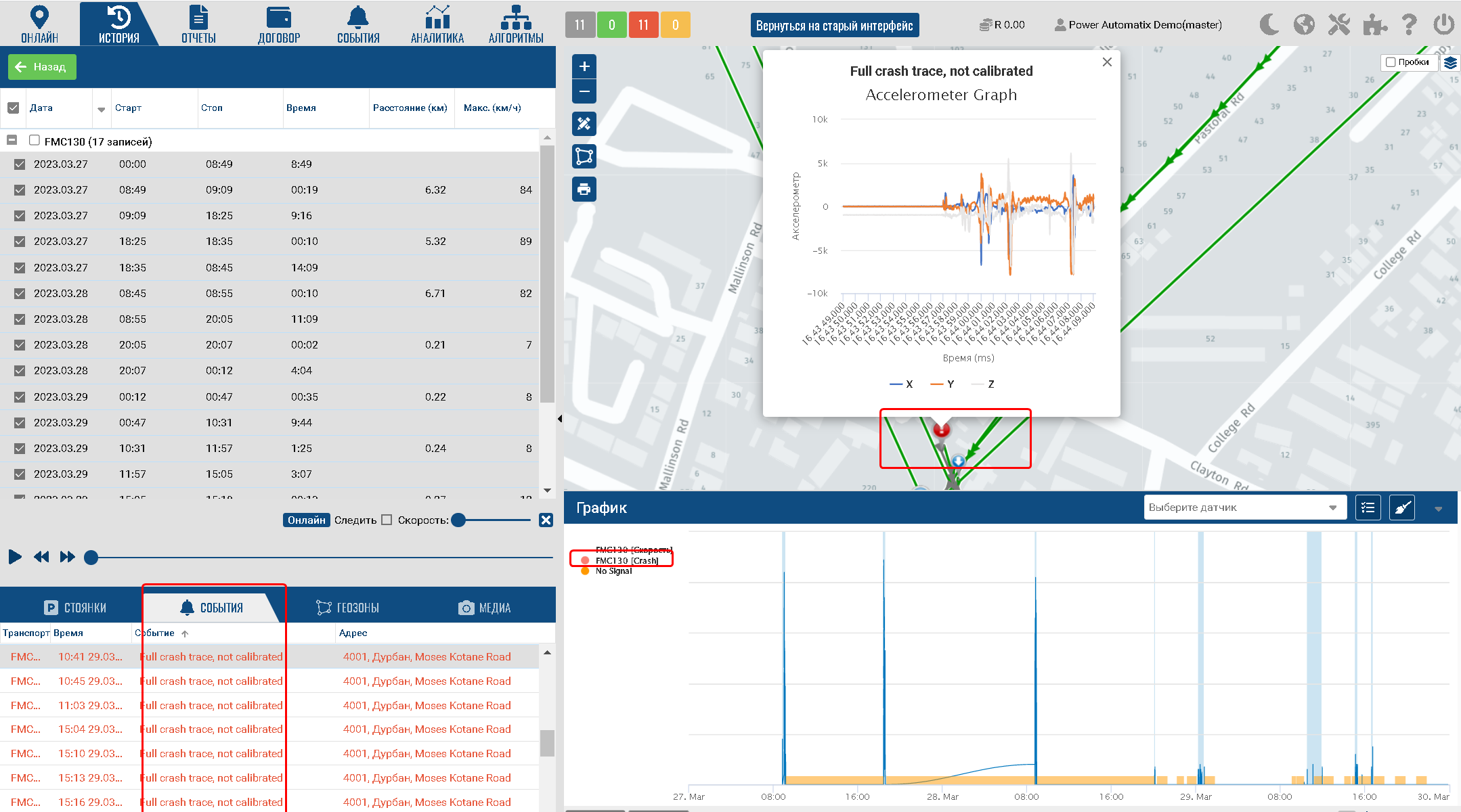 • On the speed graph, a separate graph appears showing the accident event itself on the time line.