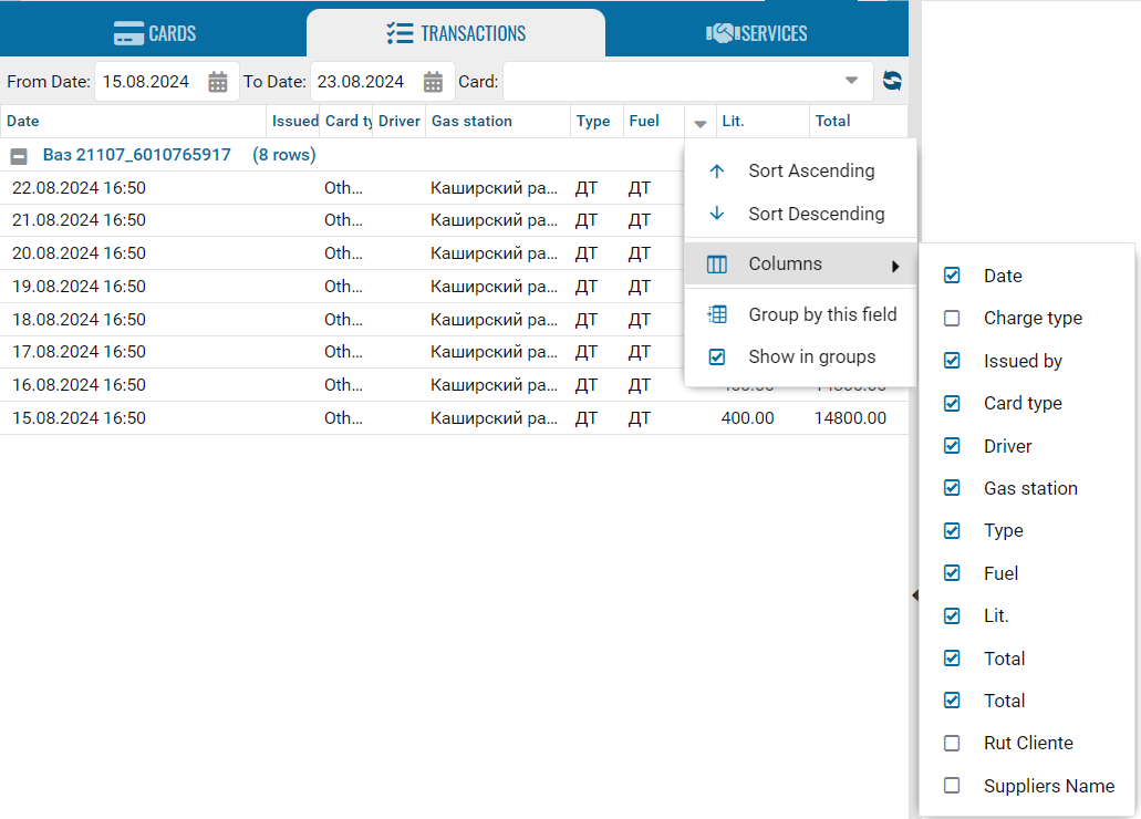 Add a card +• Specify the card number.• Gas station type.• Object.• Date added.• Save.