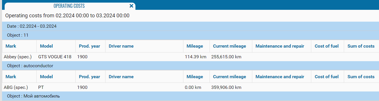• Mileage - total mileage of the object in km;