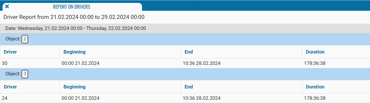 The driver report is designed to display information about the drivers assigned to the vehicle (object of monitoring).