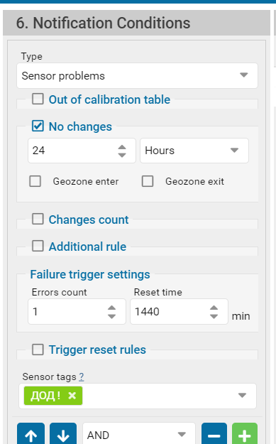 It is used to set additional conditions that must be met in order to receive a notification about a sensor failure.