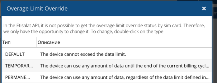 PERMANENT_OVERRIDE. The device can use any amount of data, regardless of the data limit defined in the rate plan.