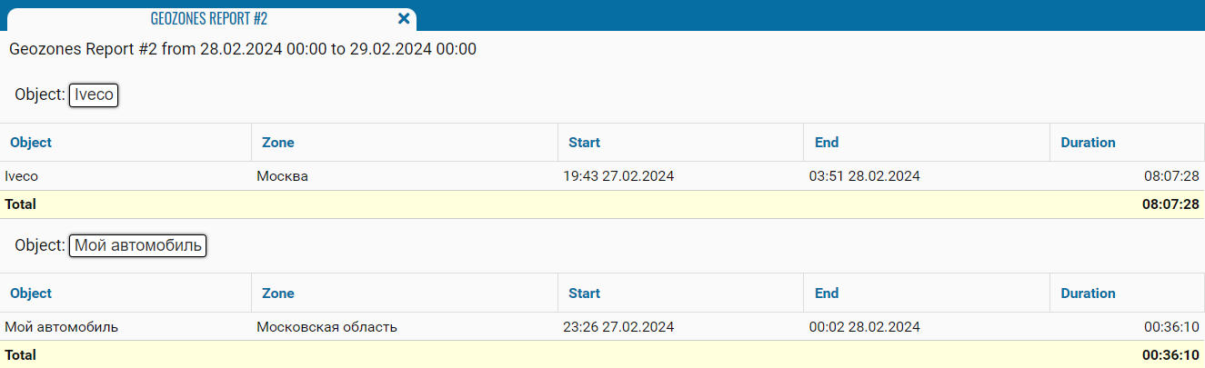 Geographical zones report 2 is designed to display data in the form of a table indicating the name of the object, time, message about arrival (entry) and departure (exit) from a certain zone, duration of stay in the specified zone, with the ability to specify a time filter (set in the object settings on the "Geofences" tab in the downtime control field).