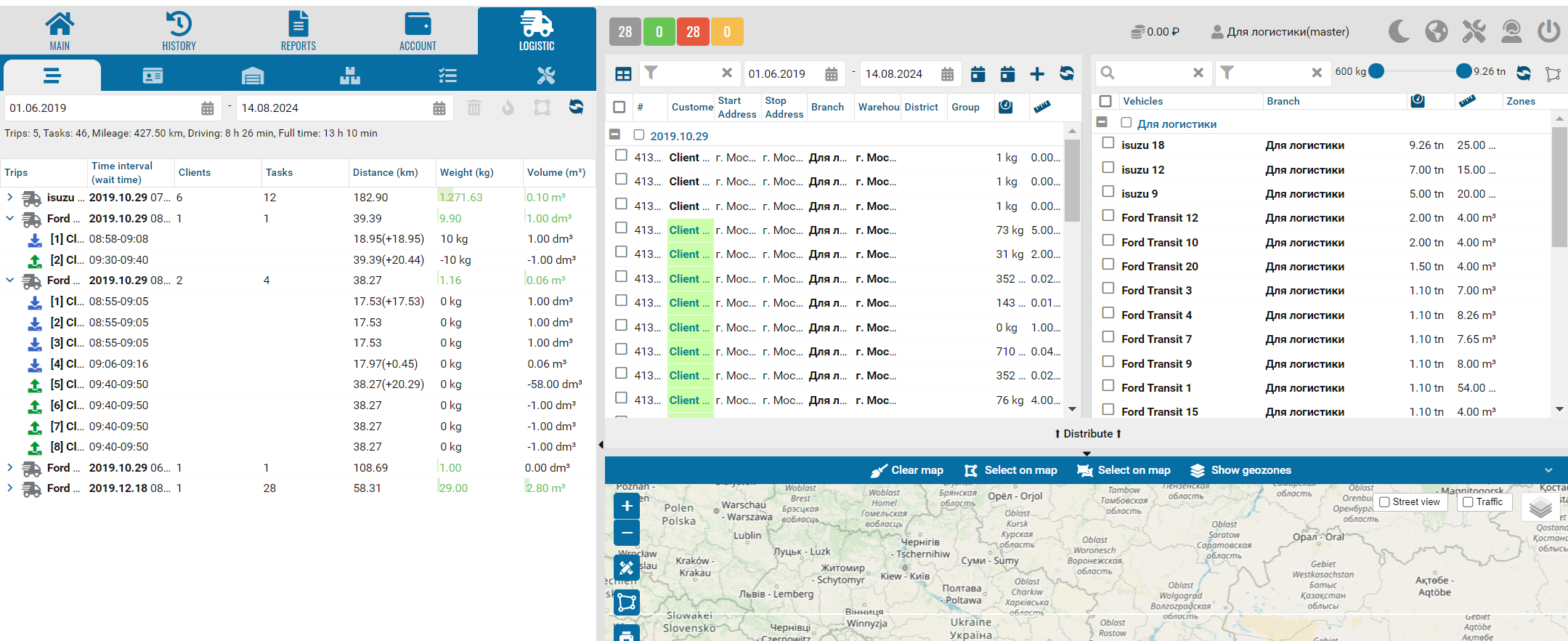 The logistics module consists of several tabs: