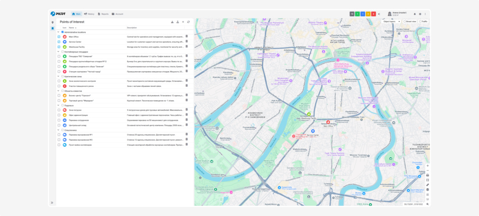 The Points of Interest module allows you to mark important locations on the map. These can include offices, warehouses, service points, parking areas — anything you need to keep track of.