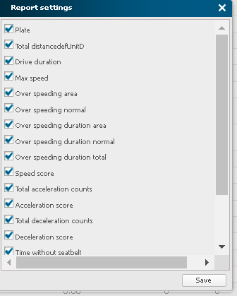• Over speeding duration total - the time during which the vehicle is traveling in excess of the established speed limit;