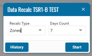 Recalculation Go to the context menu of the object. Select the Data recalculation item. Recalculation can be done by trips and zones. • Select type. • Set number of days. • Press start. • Use history.