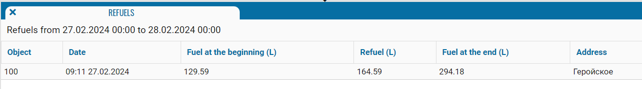 This type of report is designed to display information about the filling stations of the monitored object and includes the following data: