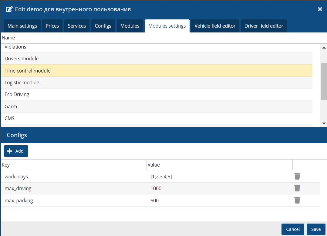 In order to automatically apply the settings of the working time parameters to the monitoring objects, you need to go to the "Module settings" tab and enter the following configuration: