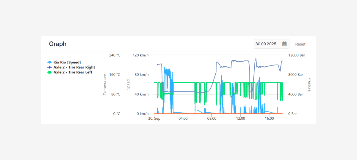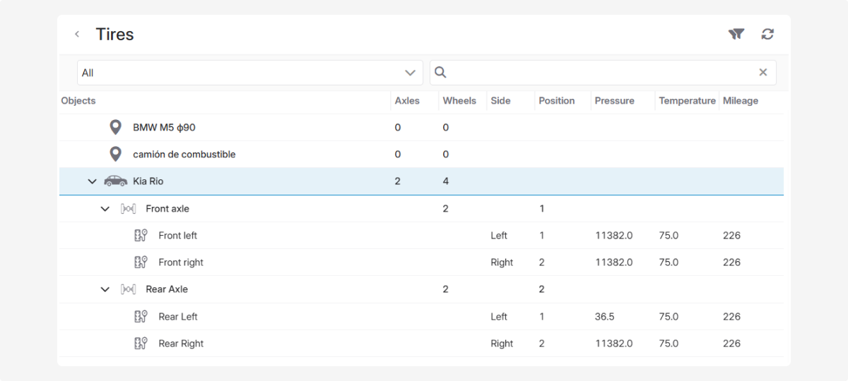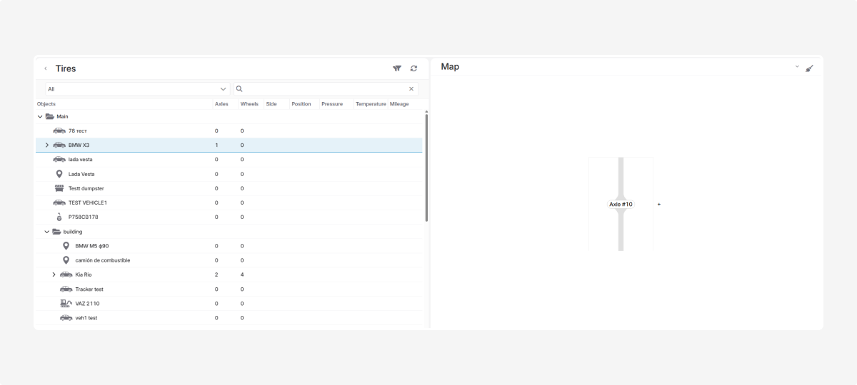 In this tab, you can track the condition of vehicle tires — monitor pressure and temperature indicators, as well as manage information about axles and tires.