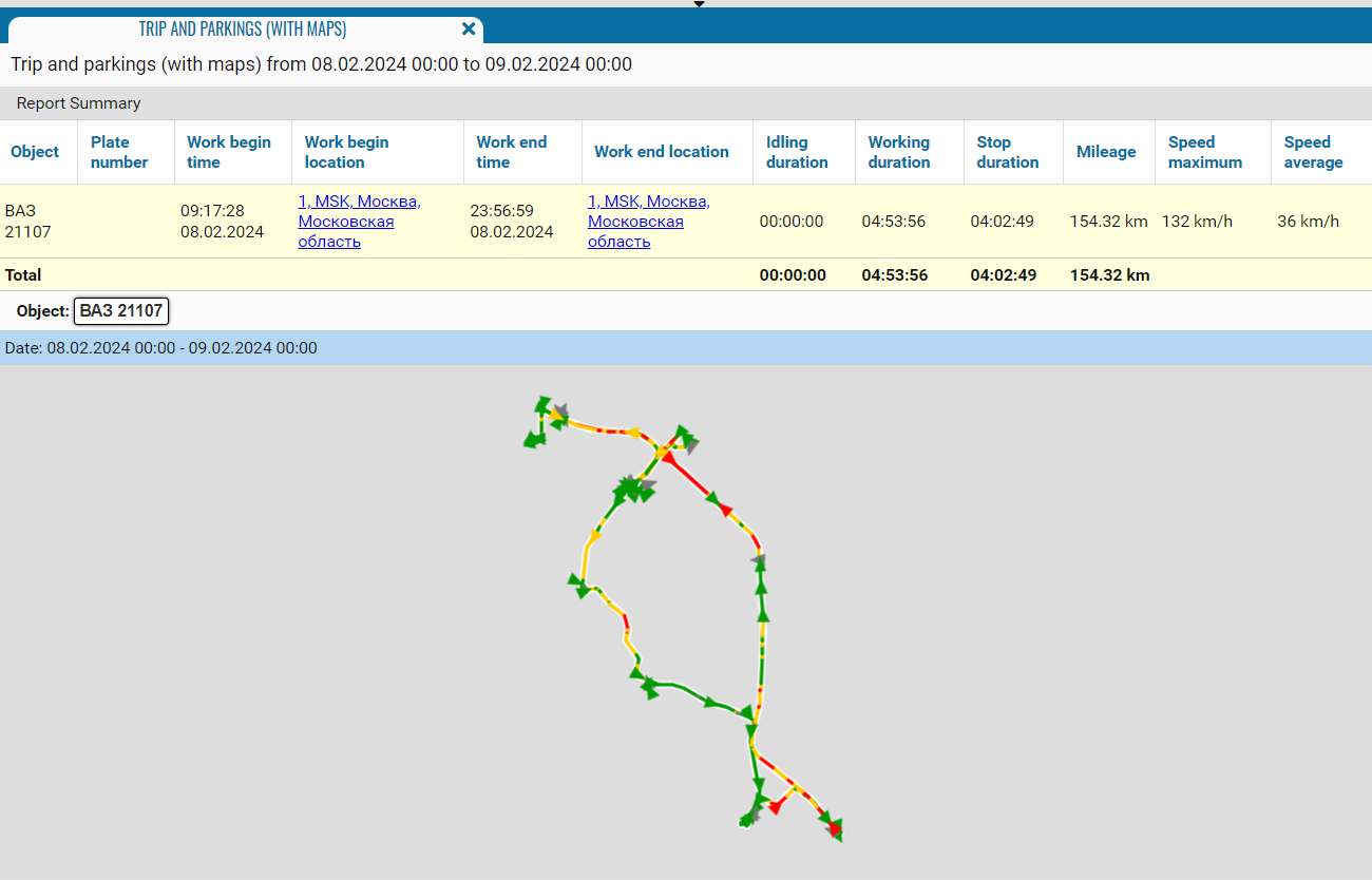 The report is designed to display trips and parking lots with a graphical representation of the trip track on the map.