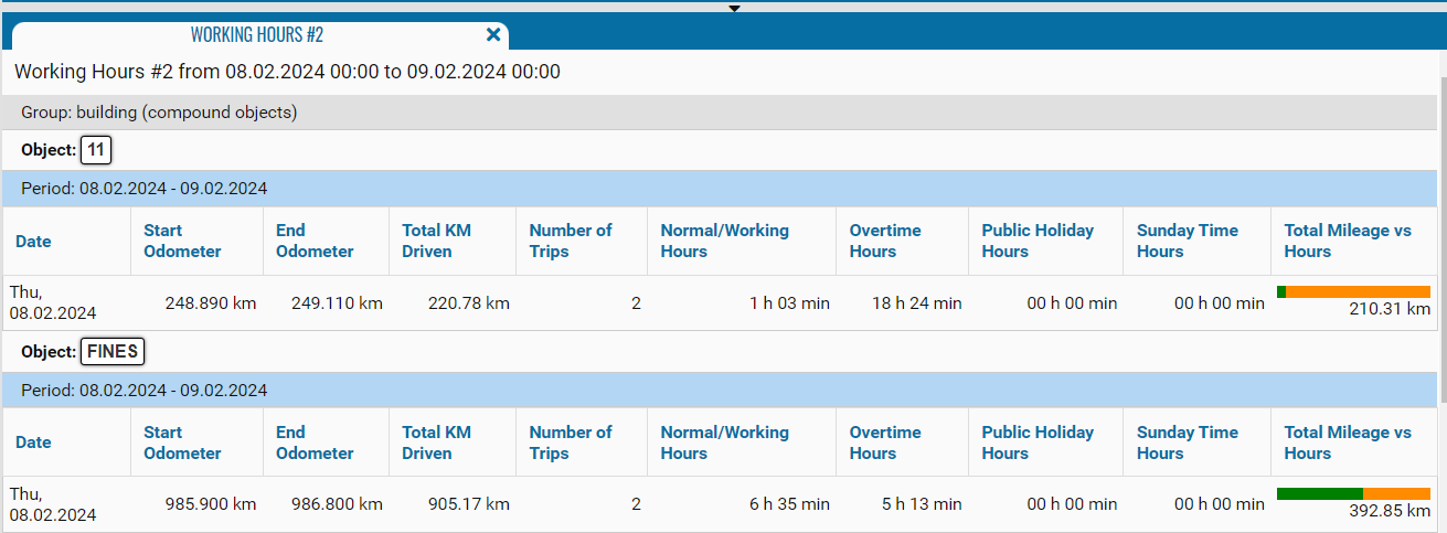 Working Hours #2 Working Hours the working time report shows the object start and end of odometer data. Number of trips, total mileage, etc.