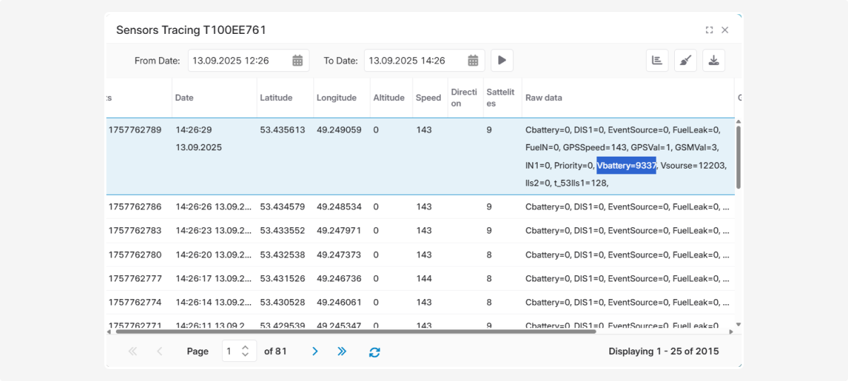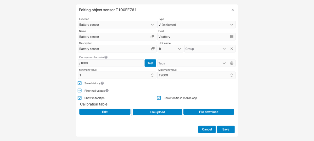 To display the usual sensor value in volts, the raw value must be divided by 1000. In the sensor settings window, in the Conversion formula field, we write: /1000.