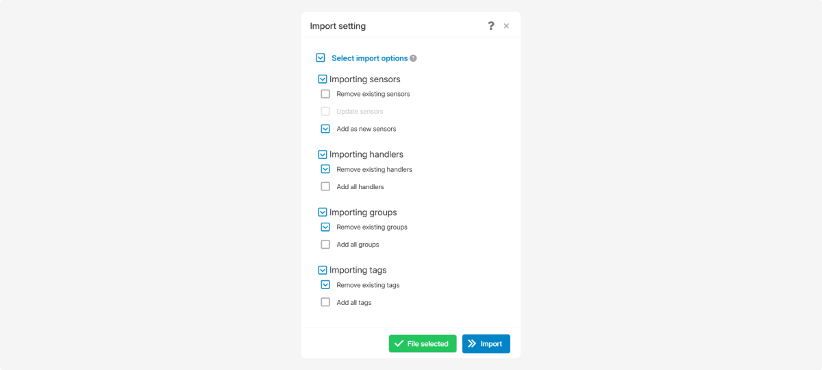 4. If needed, configure the import parameters — click Select import options. A settings window will open.