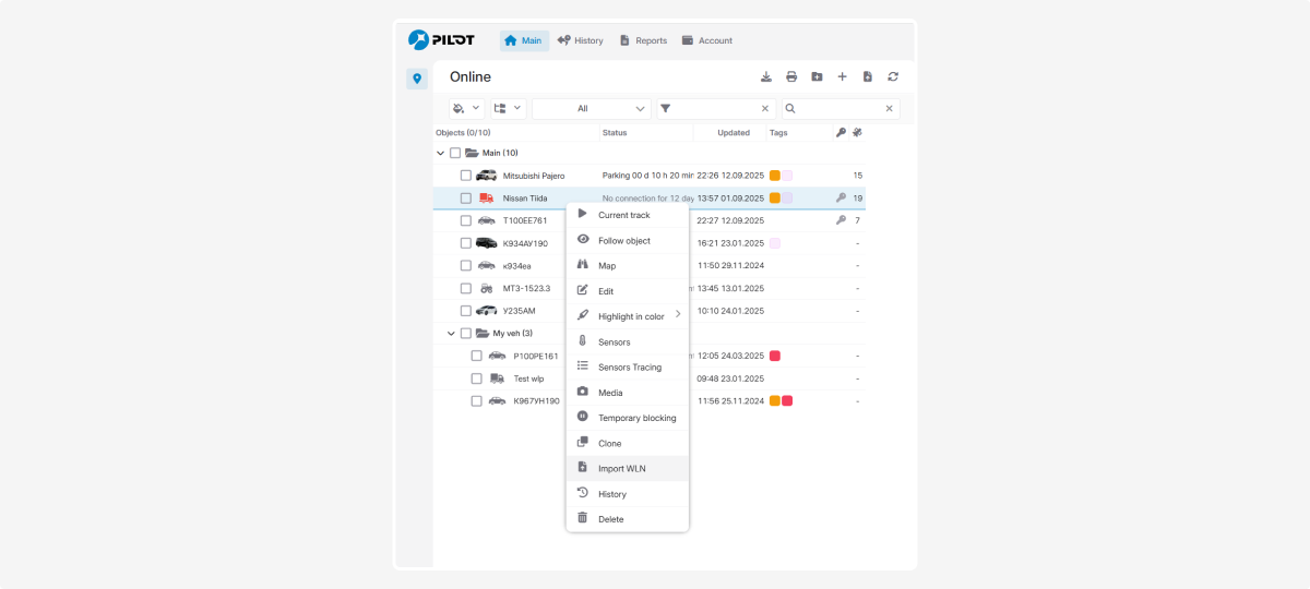 The import from WLP file feature in PILOT is designed to help clients who previously used the Wialon system.
