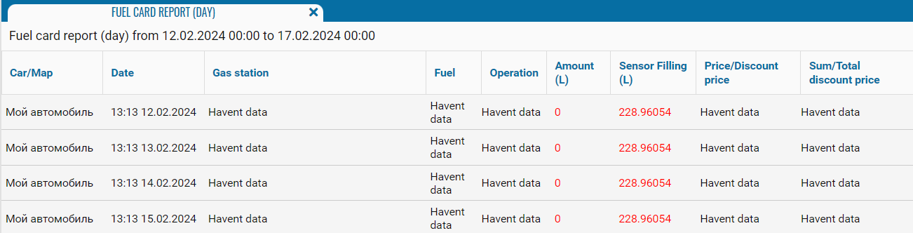 The fuel card report is designed to display data in the form of a table with the number of the fuel card associated with the facility, the date of refueling, the number of the gas station, the type and quantity of fuel, as well as the price (with a discount), the amount (with a discount) and the card balance.