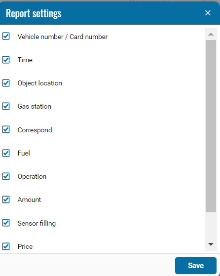 • Sensor filling - the amount of fuel filled according to the readings of the fuel sensor (When the fuel sensor is installed)