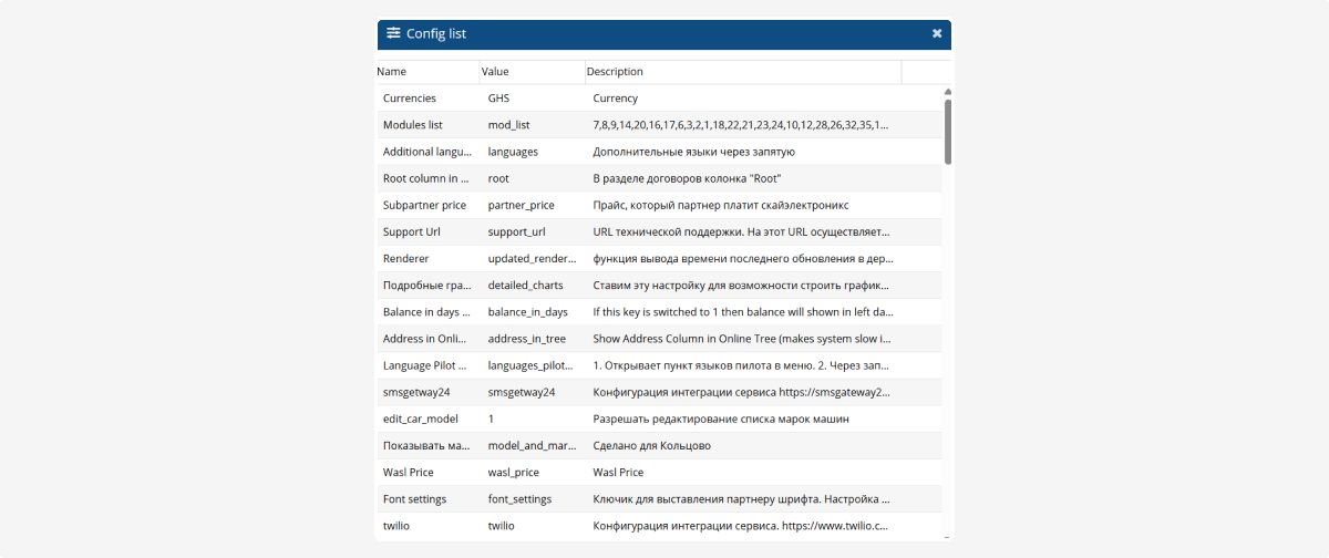 If a partner requires specific business logic (for example, SMS provider integration, custom balance display, integration with Helpdesk, Twilio, HERE Technologies, etc.), the corresponding configuration must be added with the appropriate value.