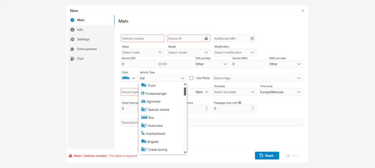If you need to add a different type of object, select the appropriate type in the Object type field: special equipment, trailer, bus or another type.