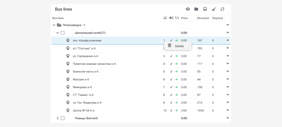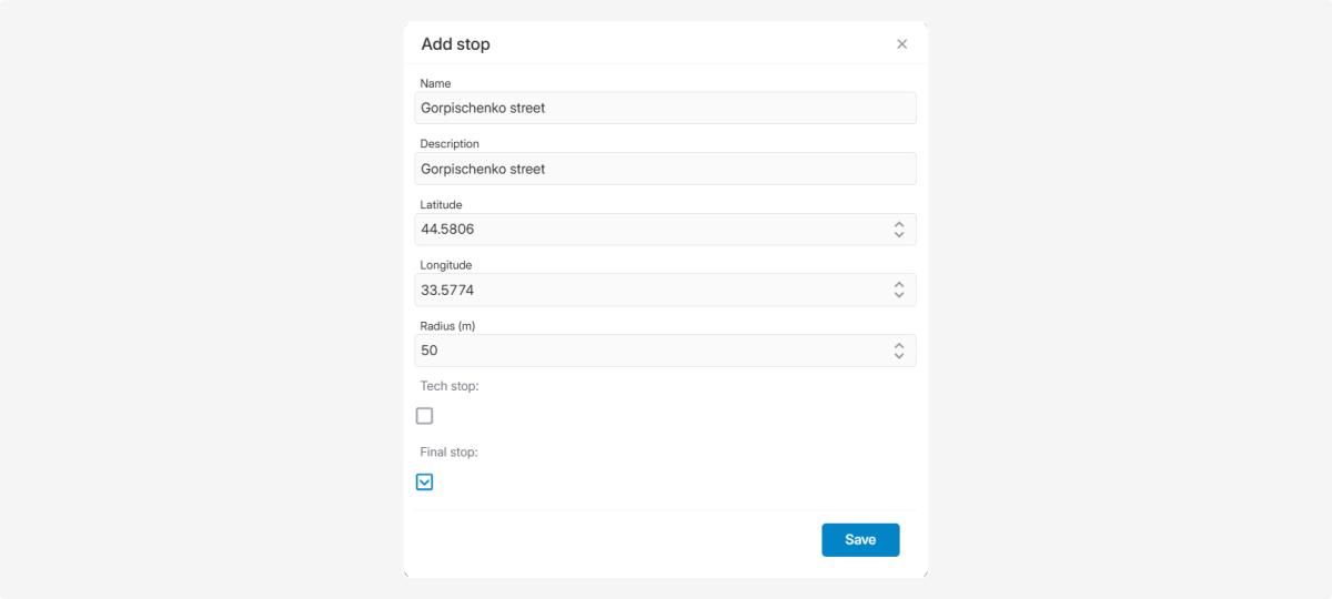 — the point where the route ends, after which the bus starts the return trip.If you mark a stop as Final, the system will treat it as the last stop on the route:-