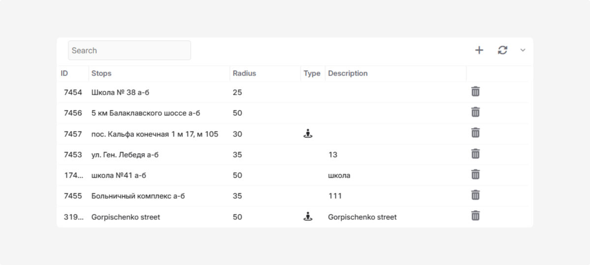 In the list, all added stops are displayed with ID, radius, type, and description.