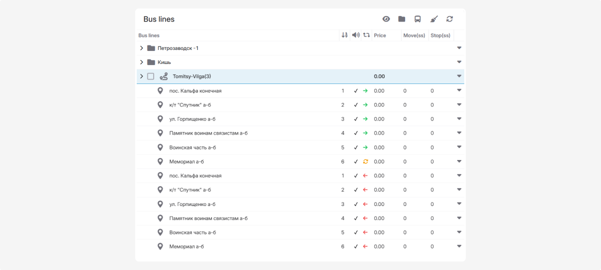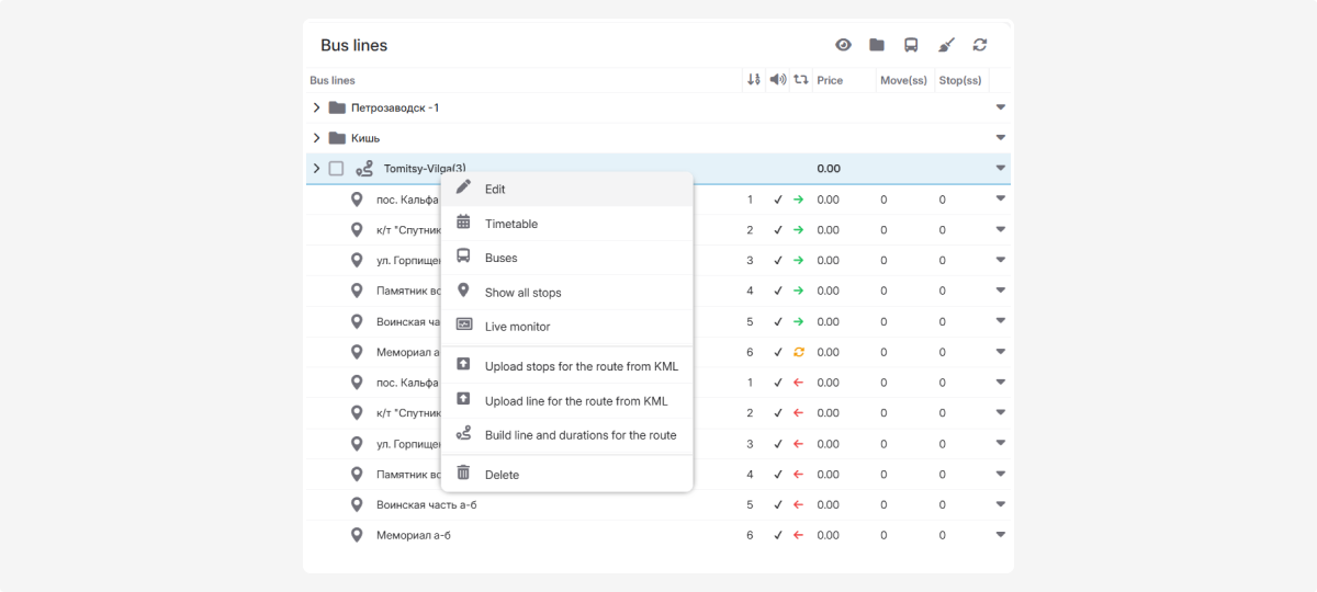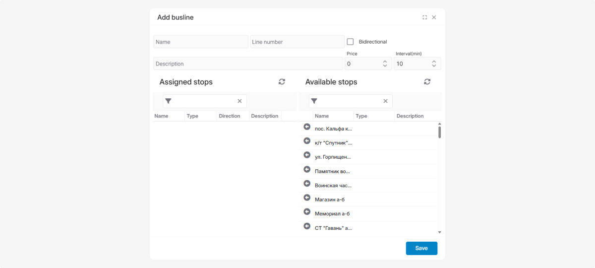 Ticket price (if applicable)4. Add the required stops to the line — select them from the list of available stops and click the arrow to include them5. Click Save — the bus line will appear in the main list