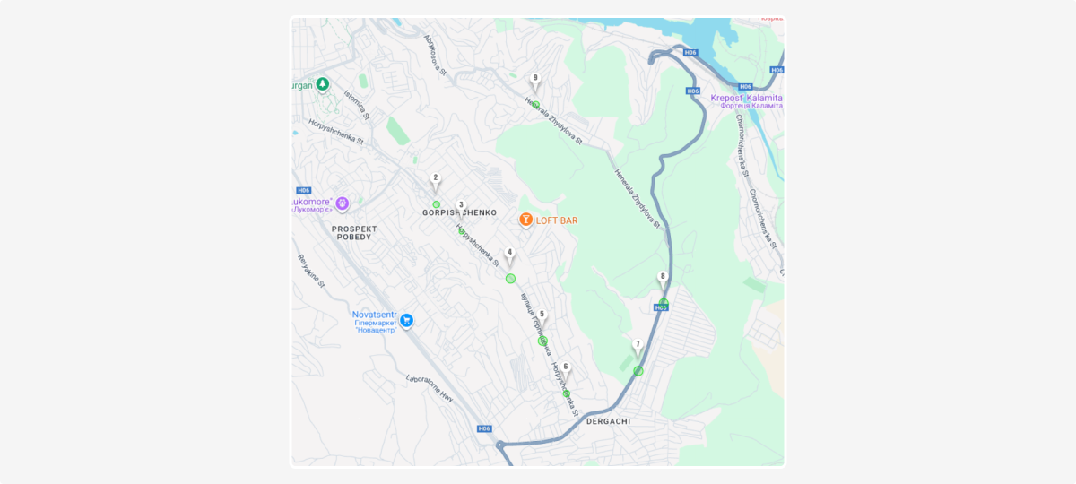 • Green and yellow lines — show the current positions of buses along the route