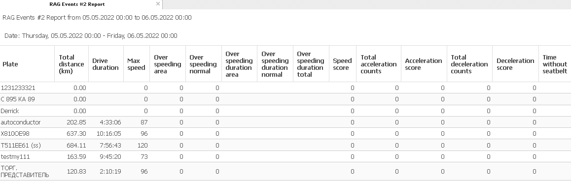 • Time without a seat belt - the time spent traveling without a seat belt during the reporting period;