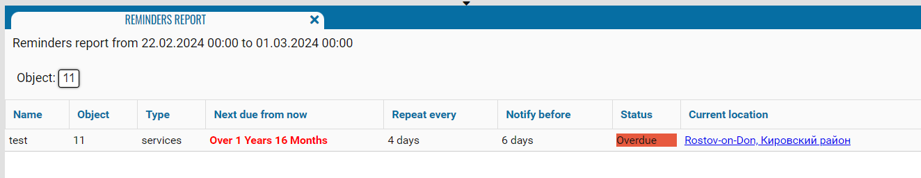 The report contains summary data about the service reminder.