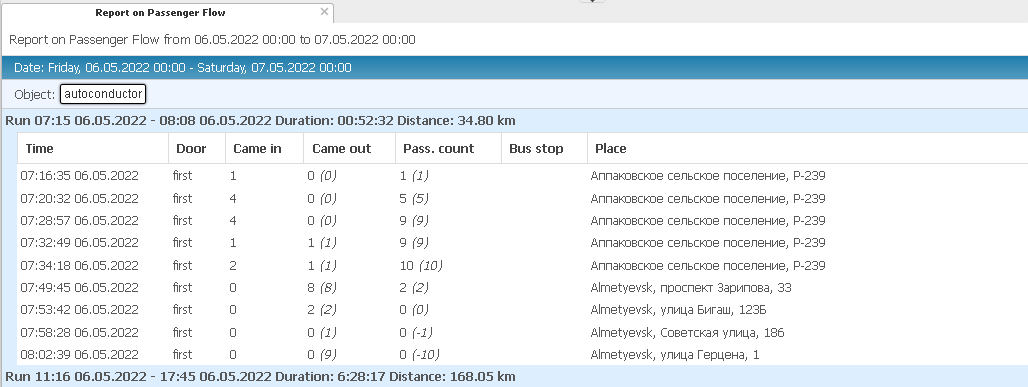 Passenger traffic report allows you to keep track of passengers who have entered, exited and their number in the bus cabin while moving along the route.