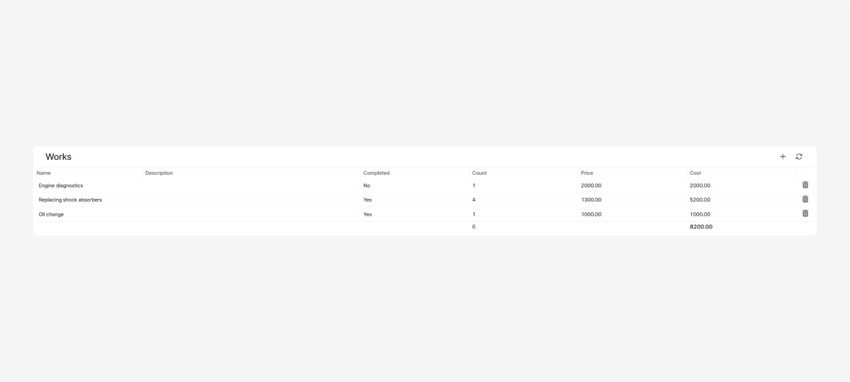 Added parts will appear in the spare parts list, and their total cost will be calculated automatically.