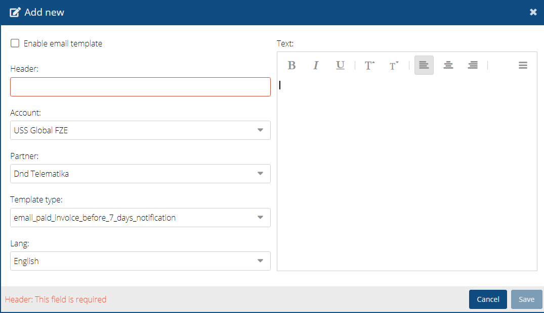 Templates Editor The Template Editor tab is intended for creating and displaying templates. The text and template type can be selected from the pop-up list in the Type field. Add new templates
