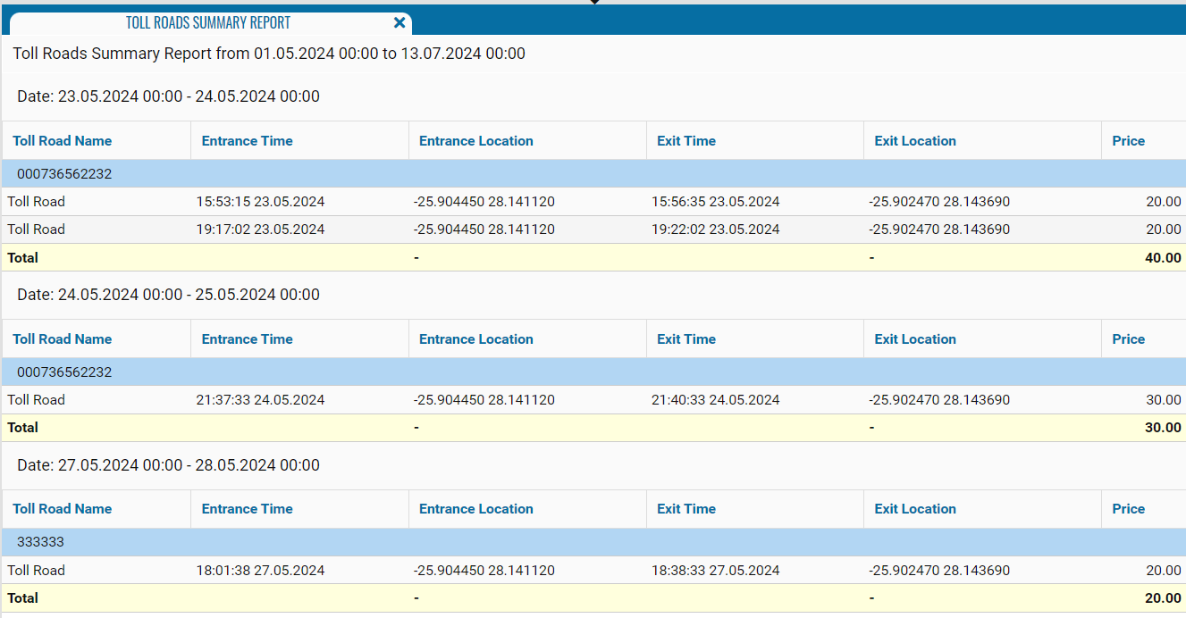 This report works provided that toll roads are configured in the Geofences module.