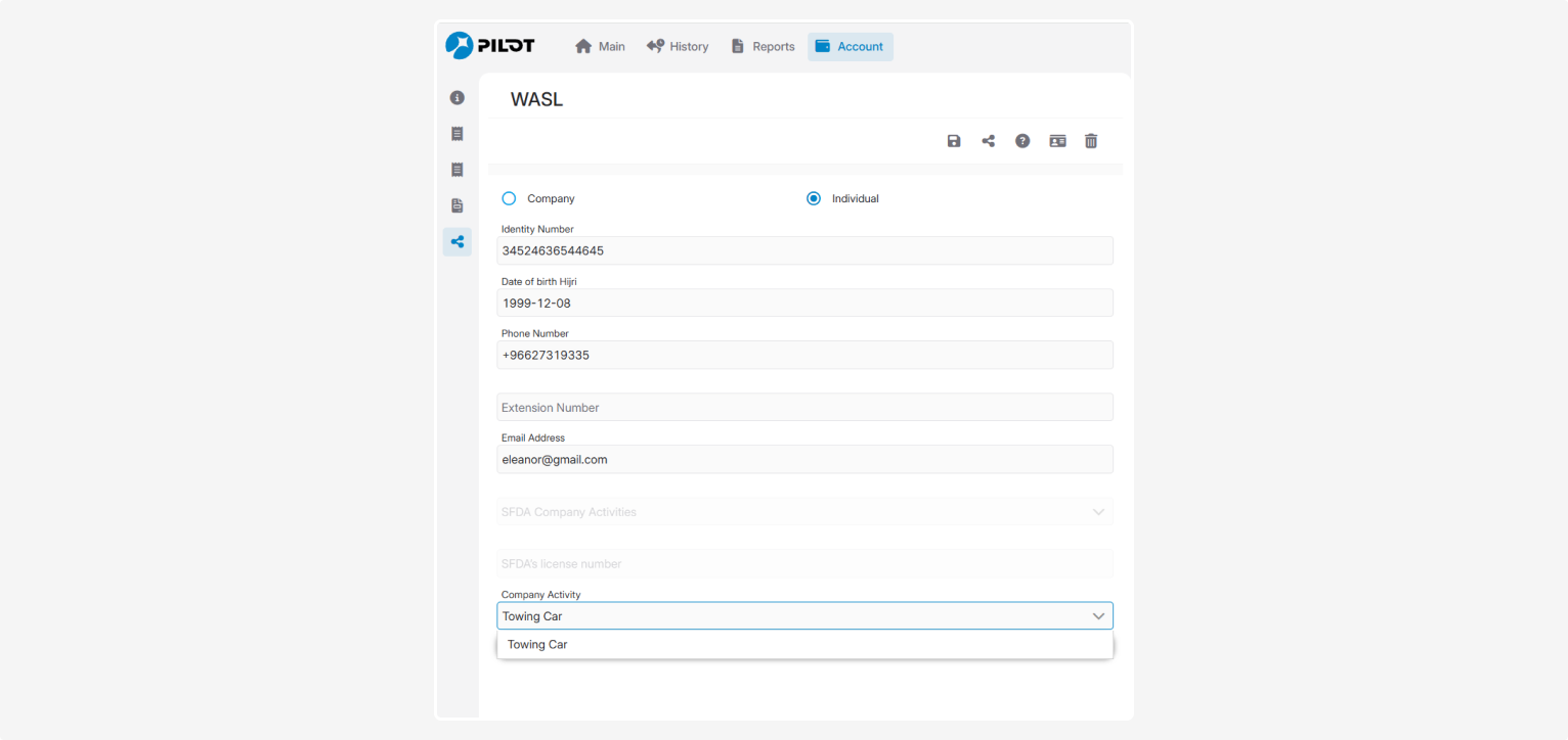 Once saved, users in their account (under the WASL tab) will be able to select Towing Car in the Company Activity field. This allows the company to register tow trucks or recovery vehicles in WASL.