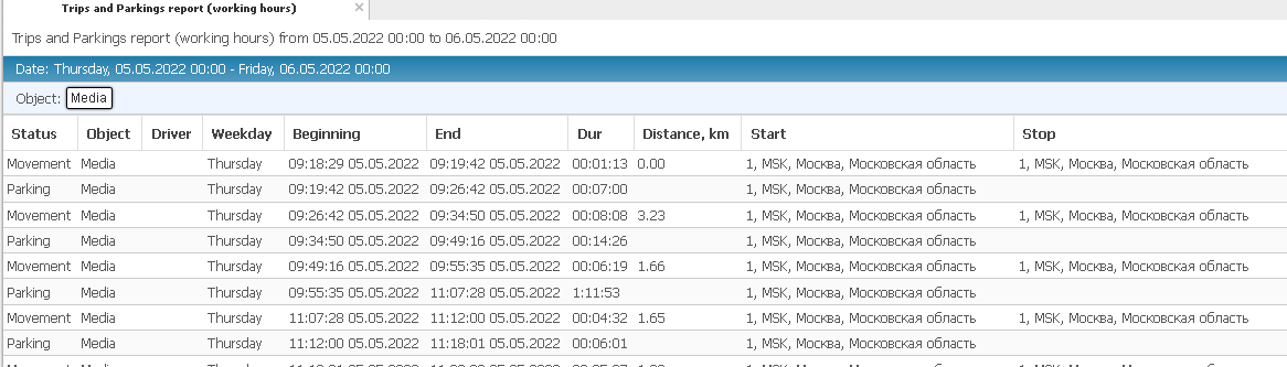 The trip and stop report (working hours) provides information about the movement status of an object in