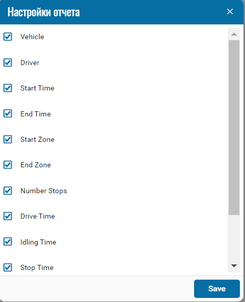 • Stop time - time of stops in zones;