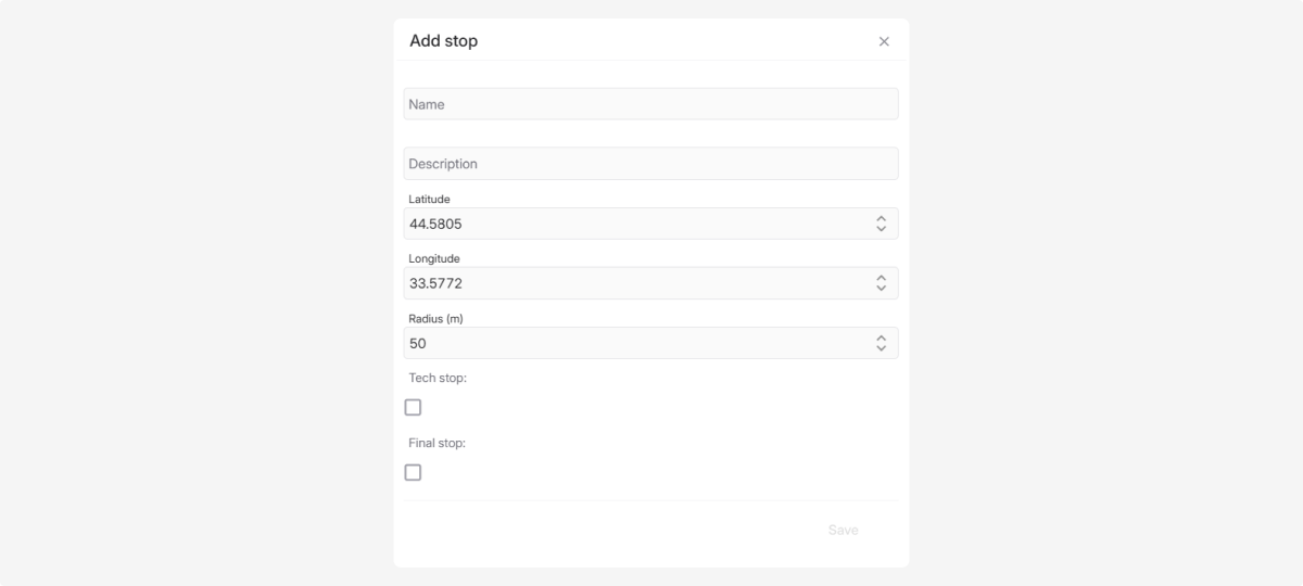 In the list, all added stops are displayed with ID, radius, type, and description.
