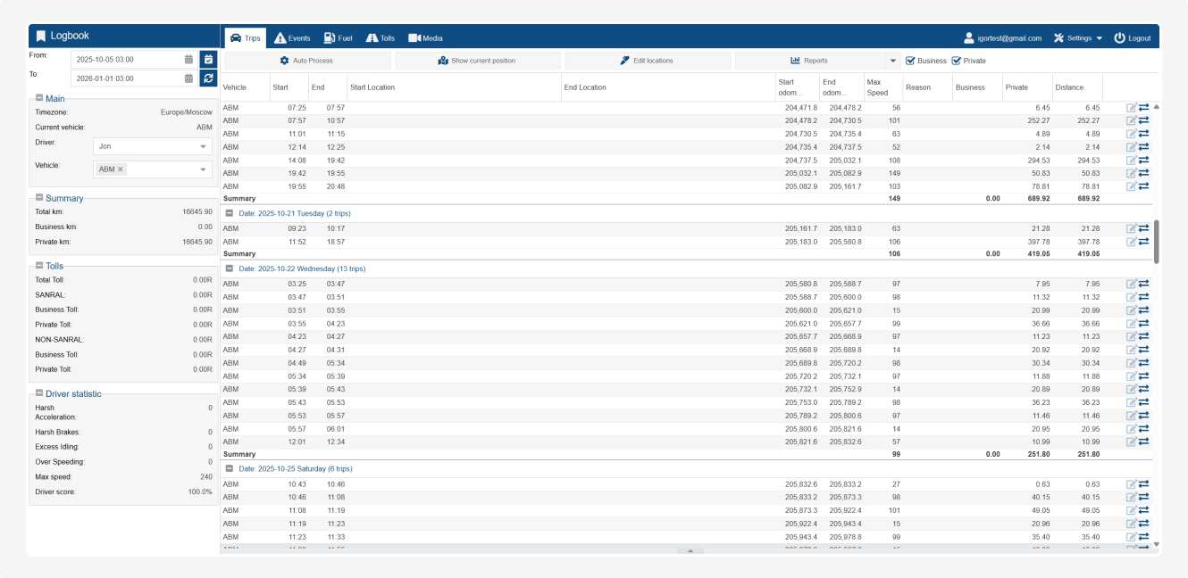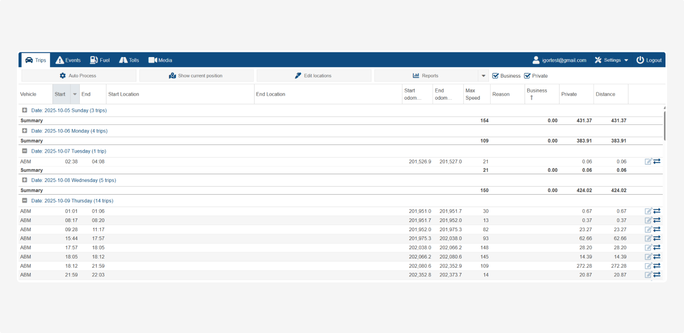 • Business and Private flags – you can filter trips using these flags: show only business, only private, or all trips