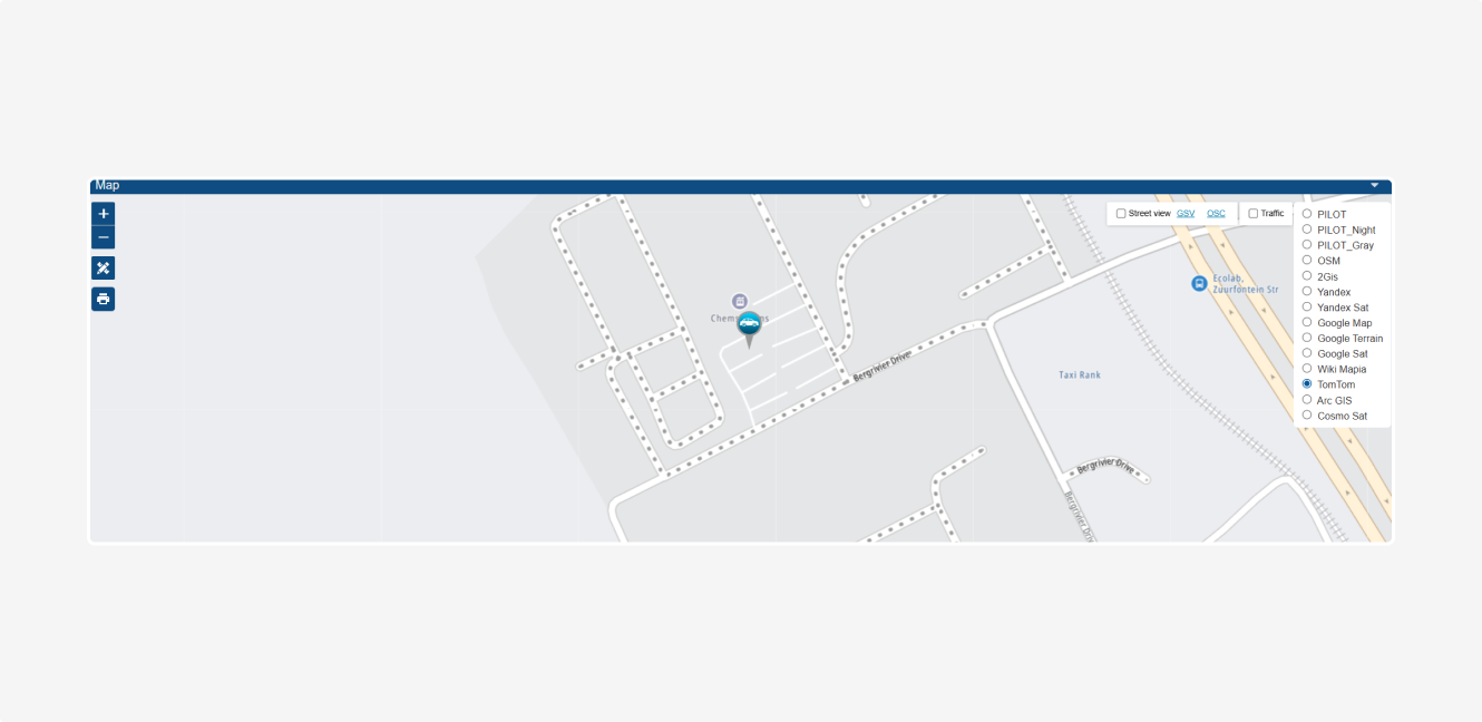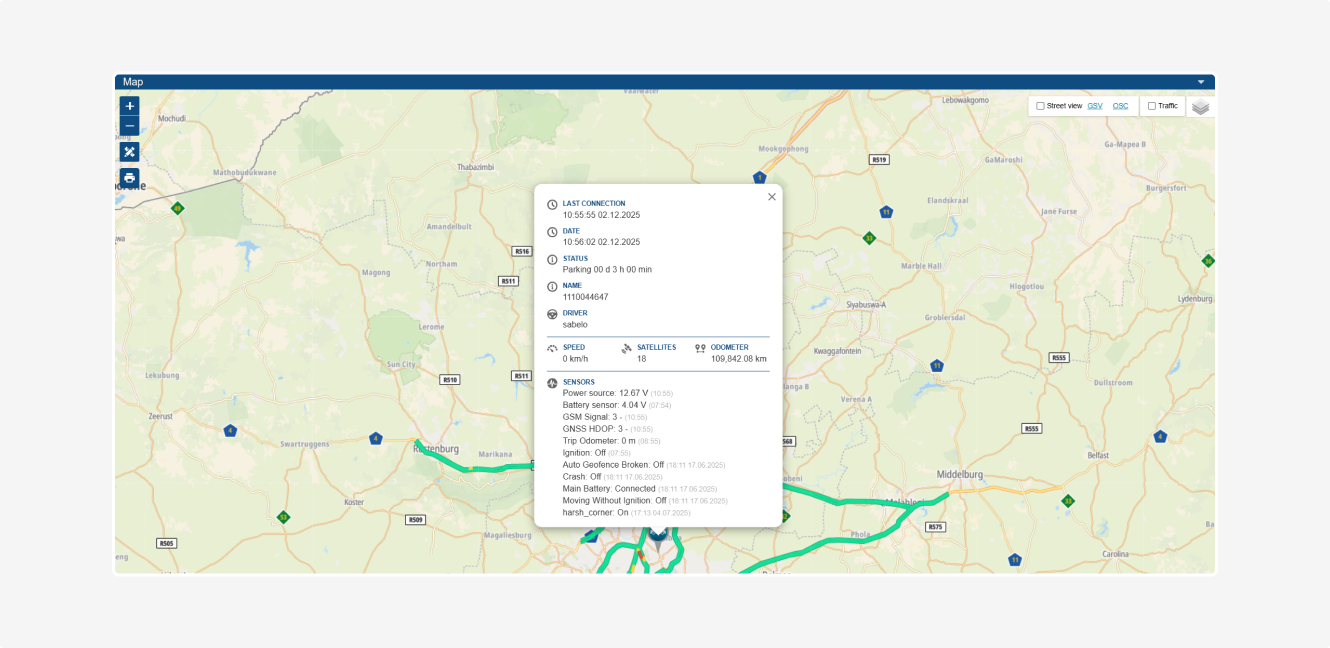 A tooltip appears when you click on an object on the map after enabling the Show current position function. It provides real-time information about the vehicle’s status.