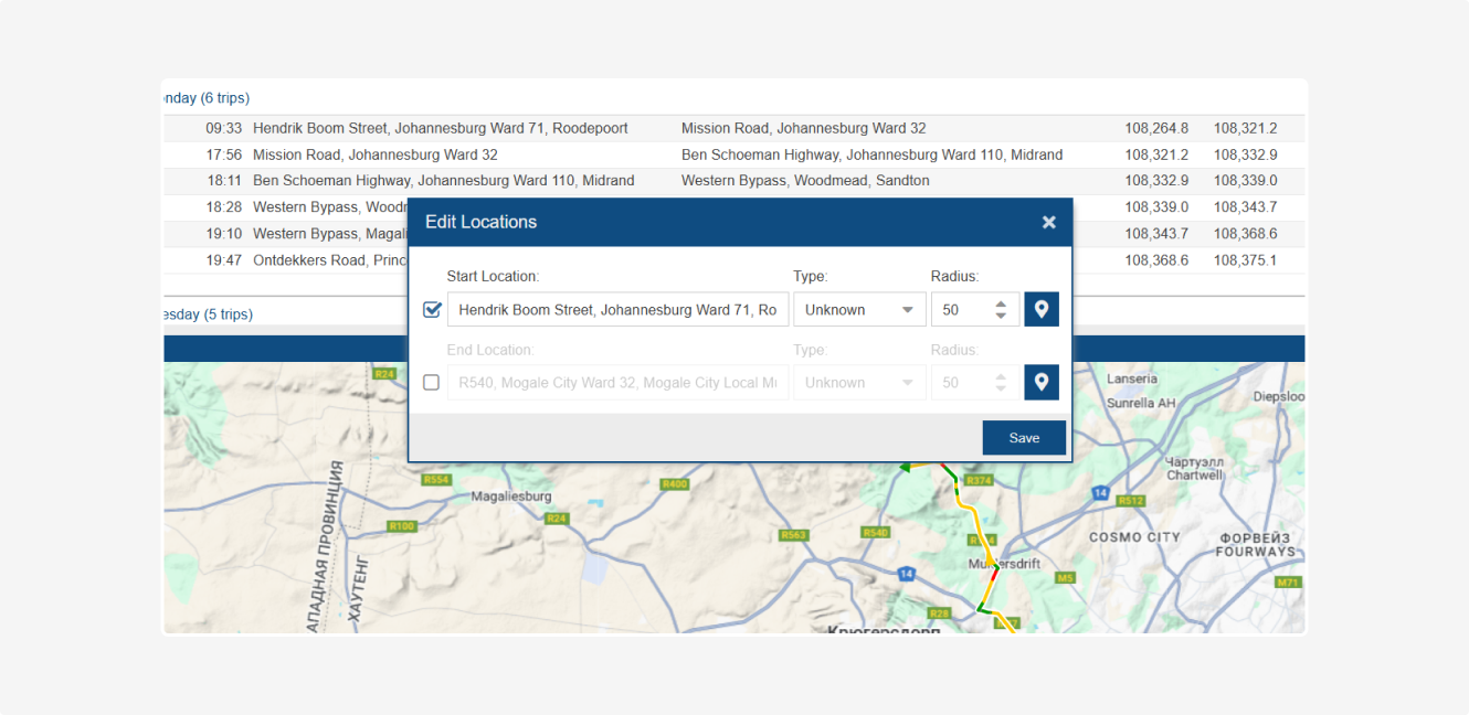 • Edit locations – helps correct or specify the start and end addresses of trips