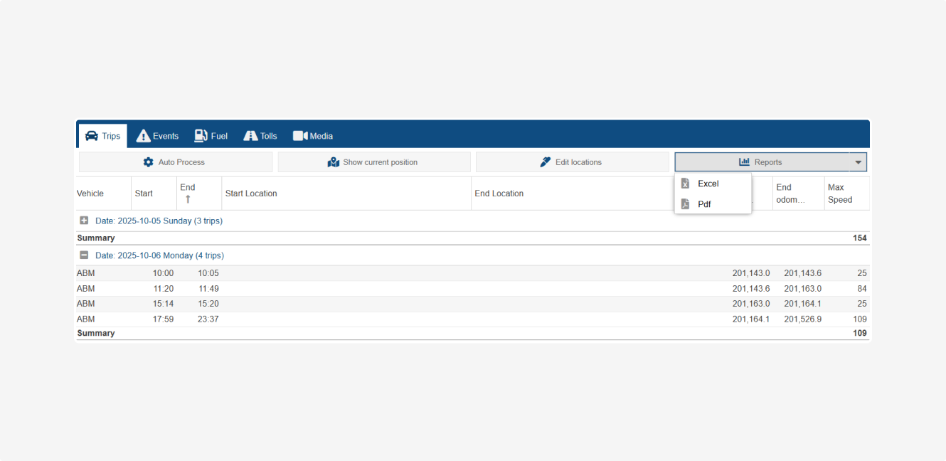 With the Reports function, you can save trip information for the selected period in PDF or Excel format.