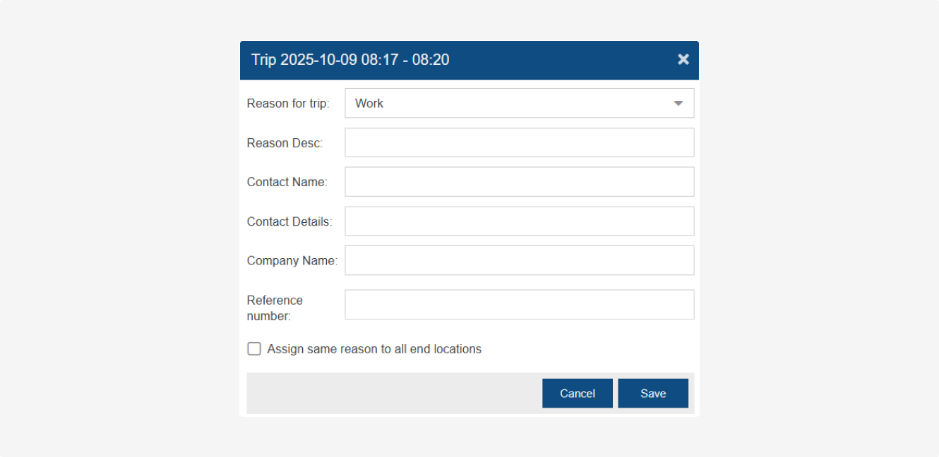 • Assign same reason to all end locations – If checked, the selected reason and details will automatically apply to all trips ending at the same location
