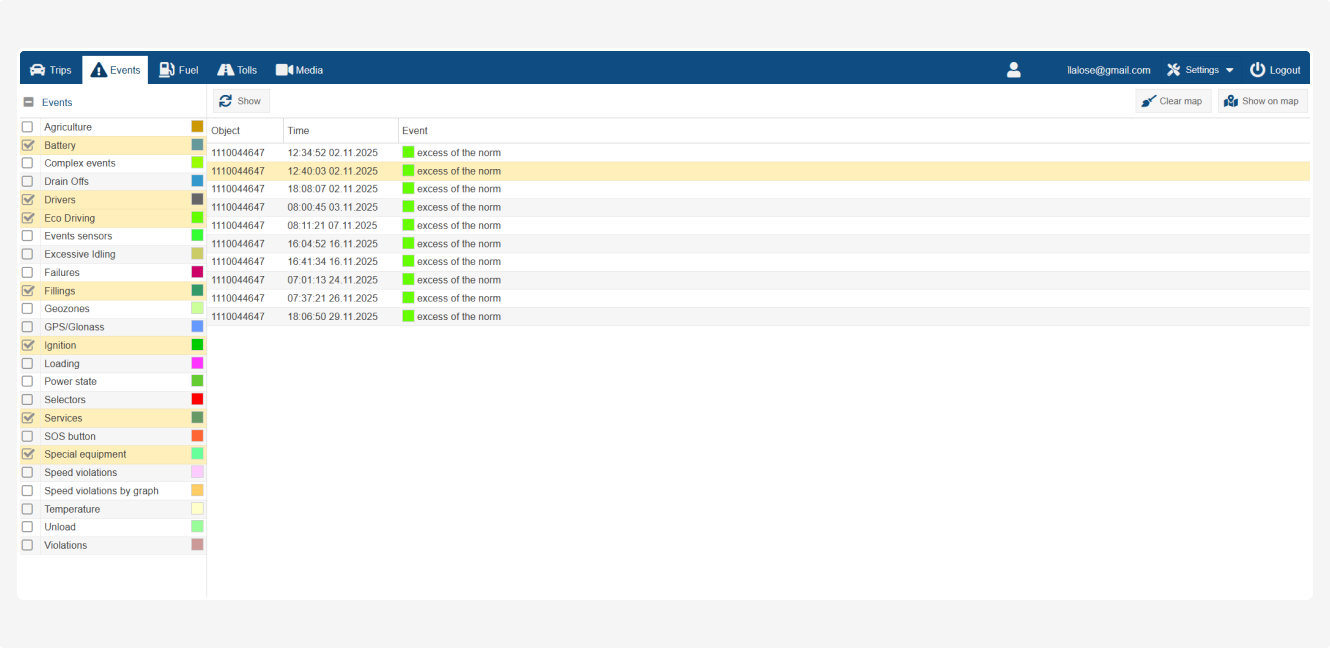 2. Check the boxes next to the events you want to view, such as Fillings (fueling), Speed Violations (speeding), or Ignition (engine on/off)
