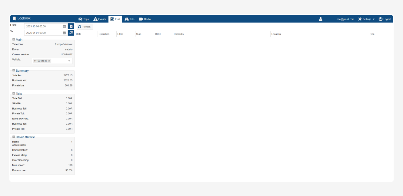 In the Fuel section, you can view all transactions related to fuel for the selected vehicle and period. Here, you can: