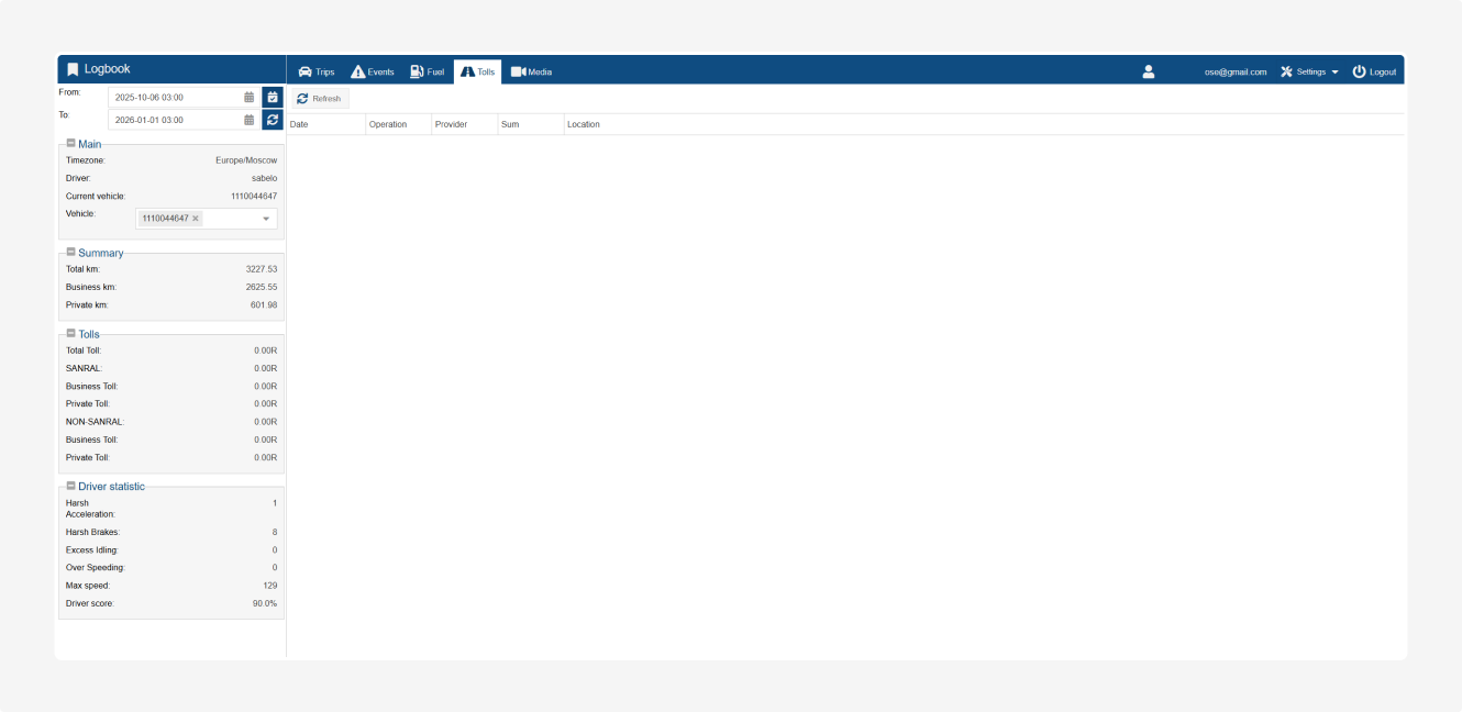 In the Tolls section, you can view all transactions related to toll roads for the selected vehicle and period.