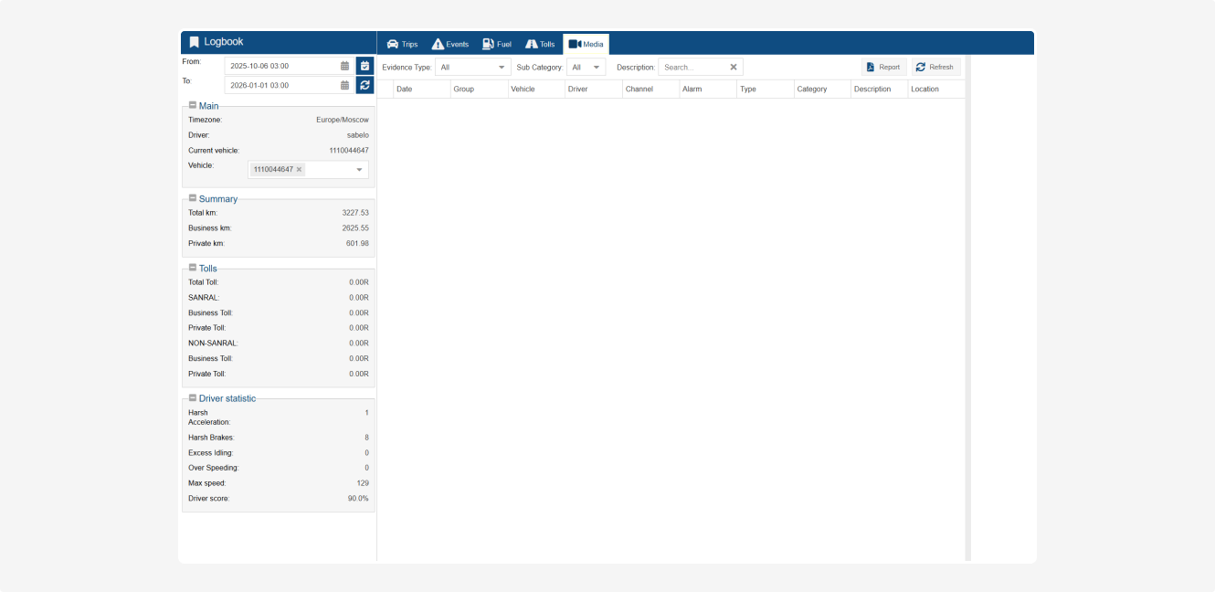 The Media section is designed for working with video and photo files captured by in-vehicle cameras.