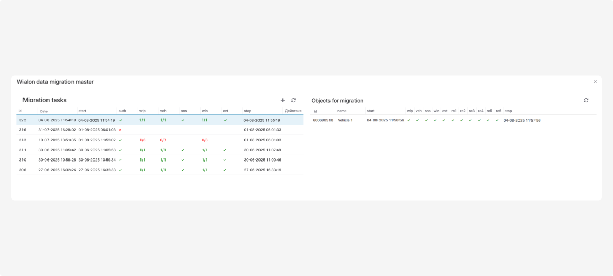 After running task ID: 322, the only Wialon object was fully and successfully transferred to PILOT.