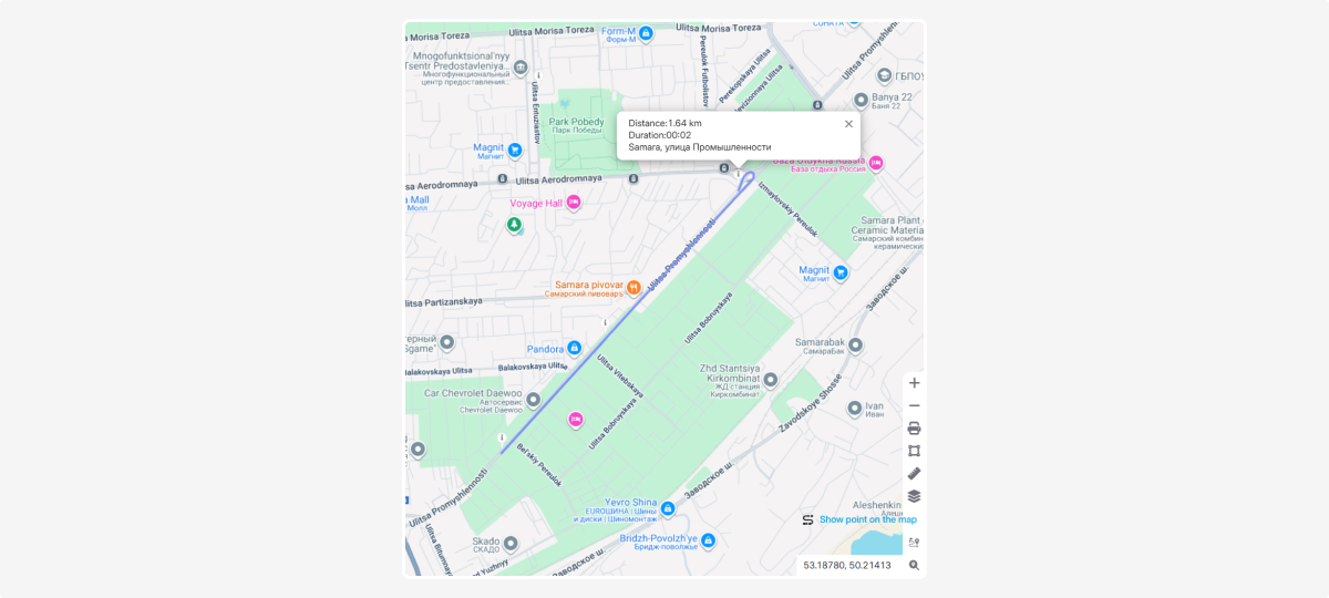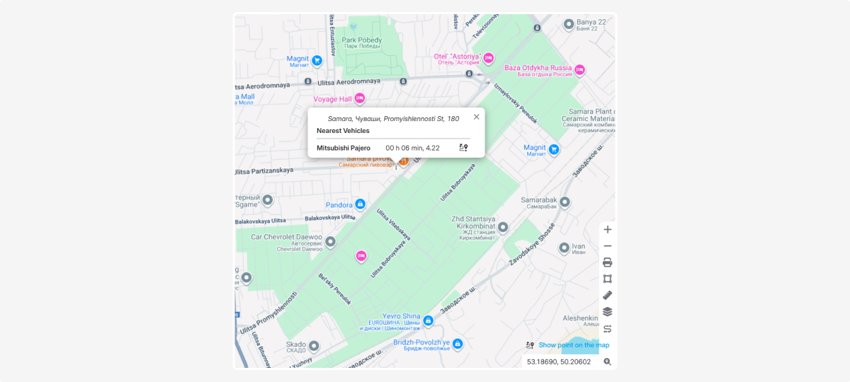 This tool helps you quickly find the nearest vehicle and see the distance to it from a selected point on the map.