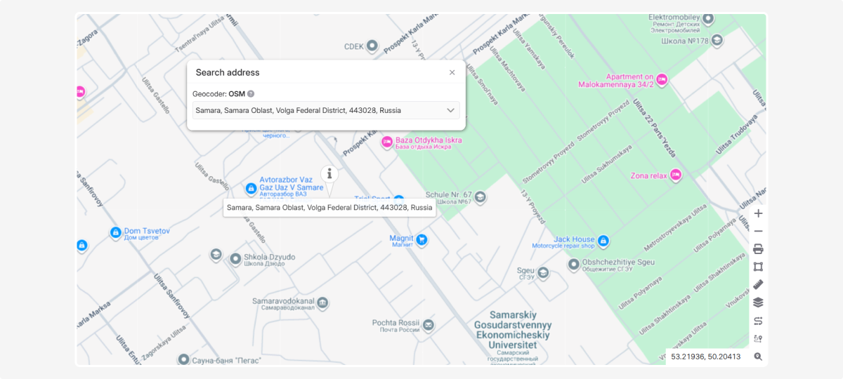 The geocoder lets you find a point on the map by address.